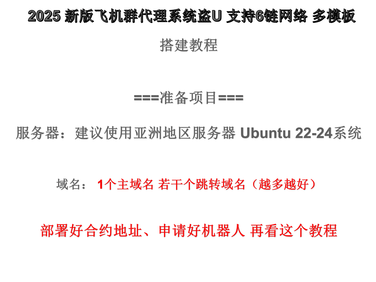 建议使用亚洲地区服务器 Ubuntu 22-24系统 域名: 1个主域名 若干个跳转域名(越多越好) 部署好合约地址、申请好机器人 再看最后教程