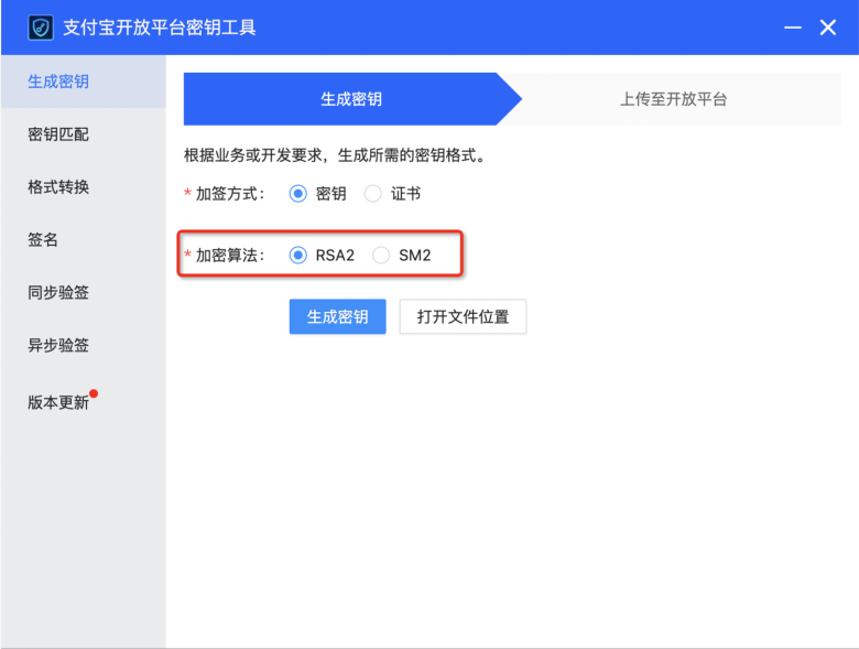 下载并安装 支付宝开放平台密钥工具。打开选择加签方式选择密钥后,选择加密算法。