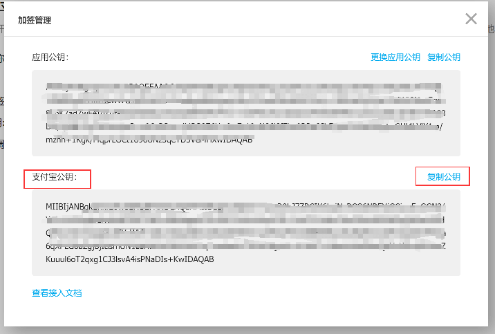保存设置之后,会出现一个【支付宝公钥】,将支付宝公钥复制后填写我们网站后台的当面付通道里的