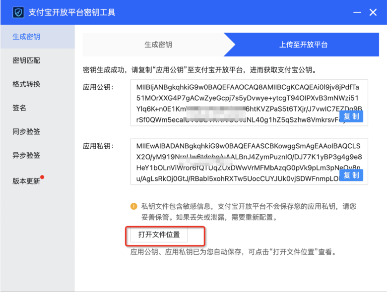 第三步:点击【生成密钥】,将【应用私钥】复制填写到我们网站后台的当面付通道里的